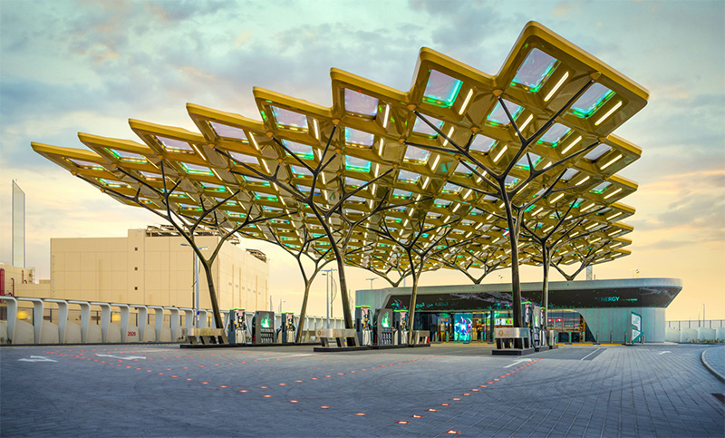 整個(gè)車站的設(shè)計(jì)形狀類似于阿聯(lián)酋國樹 Ghaf 的外骨骼。八個(gè)樹干支撐著車站的頂篷,由 22,500 平方米的碳纖維制成。第九個(gè)行李箱支撐著與主頂篷分開的充電站頂篷。 140 個(gè)兩層 ETFE 靠墊形成了這些令人難以置信的檐篷。