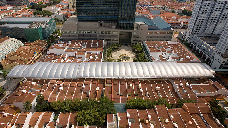 南京街是新加坡早期的街道之一,其歷史可以追溯到 1822 年。將近 100 年后,這條富有傳統(tǒng)的街道已成為一個(gè)以供應(yīng)令人愉快的深夜餐點(diǎn)而聞名的文化熱點(diǎn)。南京街已被改造成一個(gè)步行街,其中包括著名的中華廣場。華夏廣場擁有許多商店、餐廳、辦公室和住宅樓。雖然在 20 世紀(jì)中葉,南京街因其被分隔成沒有窗戶或通風(fēng)的小隔間的小商店而臭名昭著,但該區(qū)域現(xiàn)在已被 ETFE 屋頂覆蓋。這個(gè)屋頂為所有穿過南京街的人提供了愉快的體驗(yàn),天氣悠閑地購物,享受美食,甚至是在該地區(qū)工作和生活的人。 ETFE 屋頂提供充足的自然采光、新鮮空氣流通和任何不利天氣的保護(hù)。