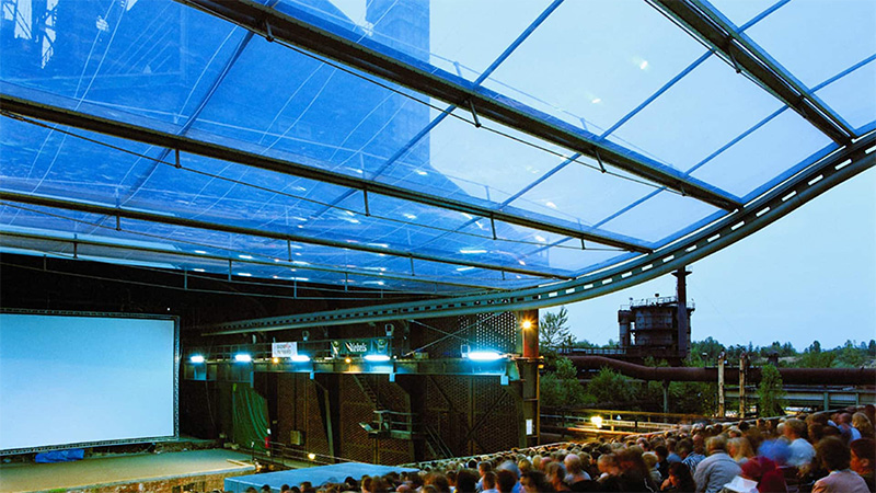 這些舊空間之一,鑄造灣 (Gie?halle),現(xiàn)在在冷高爐正前方設(shè)有一個(gè)舞臺(tái)和一個(gè)可容納 1000 名游客的看臺(tái)。舞臺(tái)和樂池完全有屋頂,而看臺(tái)的三分之二是露天的,帶有可移動(dòng)的ETFE 天篷屋頂。這個(gè)專門的屋頂在惡劣天氣下提供遮蔭和庇護(hù)。事實(shí)證明,ETFE 是這種移動(dòng)屋頂結(jié)構(gòu)的理想材料,因?yàn)樗哂泄逃械妮p盈性和良好的透聲性??梢苿?dòng)屋頂可以非??焖俚卣归_,而不會(huì)影響競(jìng)技場(chǎng)的聲學(xué)效果